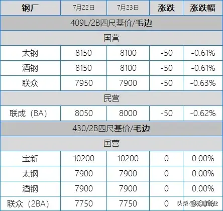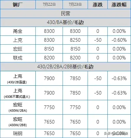 目前市場主流報(bào)價(jià):410S熱軋黑皮在6100-6150元/噸;430熱軋黑皮在6700-6800元/噸;太鋼/酒鋼430/2B(毛)在7850-7950元/噸;聯(lián)眾430/2BA(毛)在7700-7800元/噸;宏旺430/2BA(毛)在7700-7800元/噸;甬金430/BA(毛)在8300元/噸左右;上克430/BA(毛)在8250元/噸左右;宏旺430/BA(毛)在8100-8200元/噸;瑞鋼430/2BA(毛)在7650-7700元/噸,其中期貨價(jià)在7800元/噸左右;聯(lián)成430/BA(毛)在8200元/噸左右。