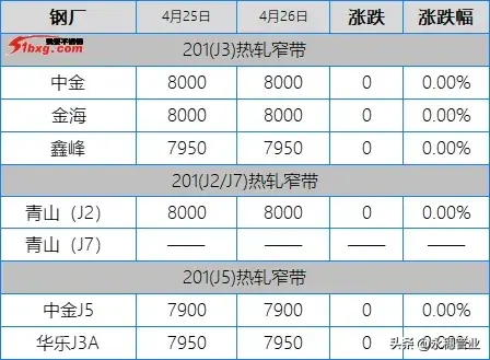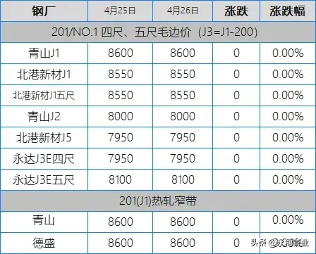 午后,304吆喝轉(zhuǎn)弱后,201開(kāi)始跟隨各種搞氛圍,多是高位報(bào)價(jià)下調(diào)20-30限量接單,而不久就接滿回歸調(diào)回高位,各個(gè)都在限量,各種好似都成交很好,但是實(shí)際接了多少可能只有自己知道。今日現(xiàn)貨市場(chǎng)含稅價(jià)格:J1: 宏旺、北港、誠(chéng)德8850-9000基;J2、J5: 8250-8400基。