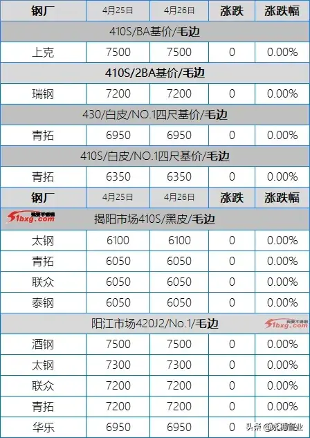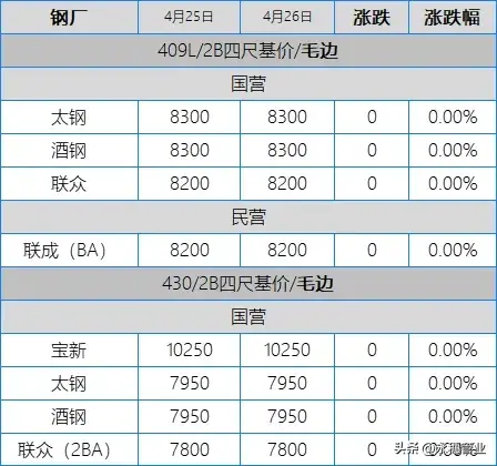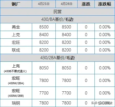 目前市場(chǎng)主流報(bào)價(jià):410S熱軋黑皮在6050-6150元/噸;430熱軋黑皮在6650-6750元/噸,其中個(gè)別高位在6800元/噸左右;太鋼/酒鋼430/2B(毛)在7950-8000元/噸;聯(lián)眾430/2BA(毛)在7750-7800元/噸;宏旺430/2BA(毛)在7750-7800元/噸;甬金430/BA(毛)在8500元/噸左右;上克430/BA(毛)在8400元/噸左右;宏旺430/BA(毛)在8150-8200元/噸;瑞鋼430/2BA(毛)在7700-7800元/噸;聯(lián)成430/BA(毛)在8200元/噸左右。