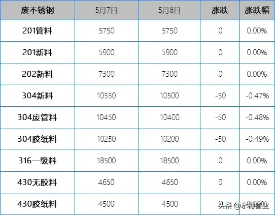 較昨日早間,今日早間市場201報(bào)價(jià)多數(shù)持平,個(gè)別下跌50元/噸;304報(bào)價(jià)下跌20-50元/噸,個(gè)別高位下跌100元/噸,目前主流報(bào)價(jià)區(qū)間:201新料在5850-5950元/噸;304新料在10400-10500元/噸。