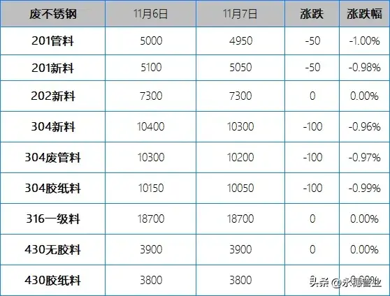 廢料方面:今日早間304下調(diào)20-100元/噸,午后反彈上漲30-80元/噸,市場具體成交以看貨定價為主;201早間部分下調(diào)30-50元/噸,午后多有跟高收貨現(xiàn)象。目前市場主流報價區(qū)間:201新料在5000-5100元/噸;304新料在10250-10350元/噸。