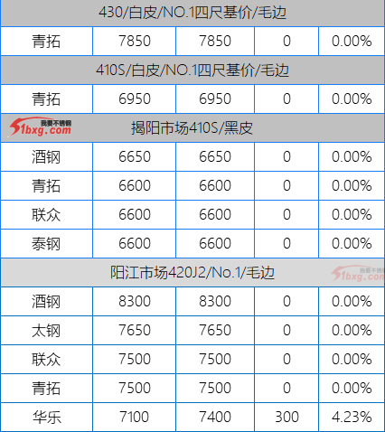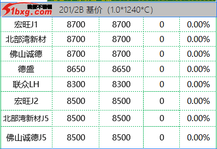 今日,青山代理報(bào),J1-8150元/噸,J3-7950元/噸,J4-8650元/噸,J2-7750元/噸,交貨期仍是3月10日前。市場(chǎng)貿(mào)易商整體報(bào)價(jià)波動(dòng)不大,但價(jià)格依然有高低不一呈現(xiàn)。可見(jiàn)報(bào)價(jià)有,鼎信J2不含稅報(bào)價(jià)7120-7150元/噸;北部灣新材報(bào)J5料7700元/噸,J1四尺8100元/噸,J1五尺8200-8250元/噸(期貨8150);寶鋼BN1TL窄帶7600元/噸,大板7700元/噸;中金J3含稅7530-7550元/噸;中金J5料、金海J3料、鑫峰J3料、永達(dá)J3料7380-7500元/噸。